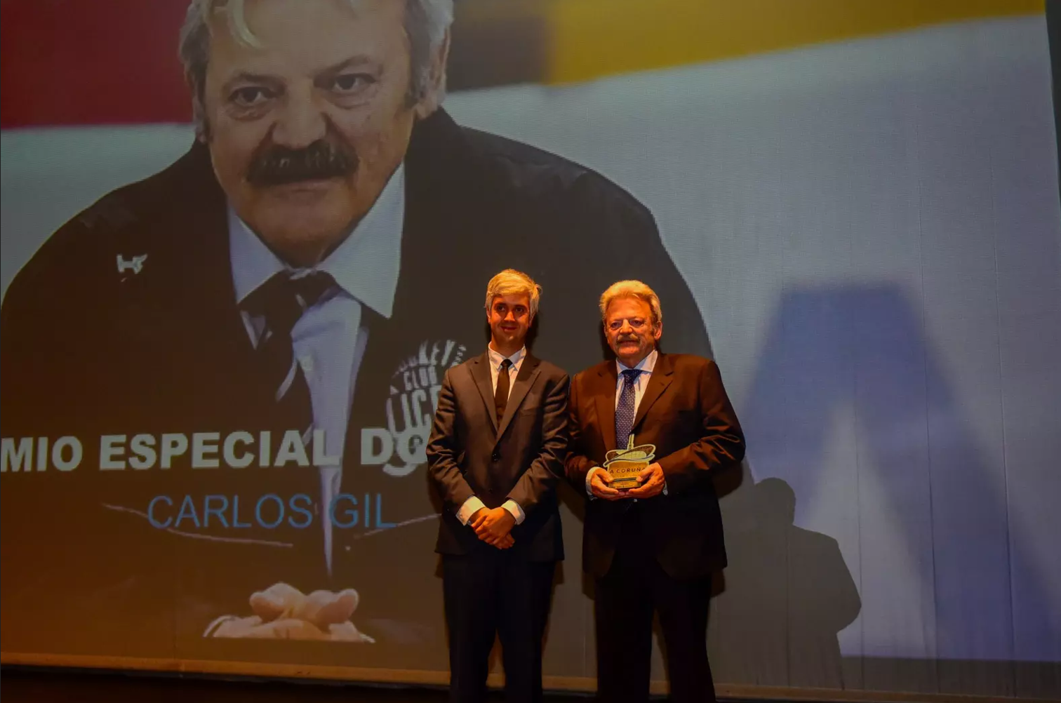 Ignacio Prada entrega el premio especial do Xurado a Carlos Gil, leyenda del hockey coruñés en la VIII Gala do Deporte da Coruña.