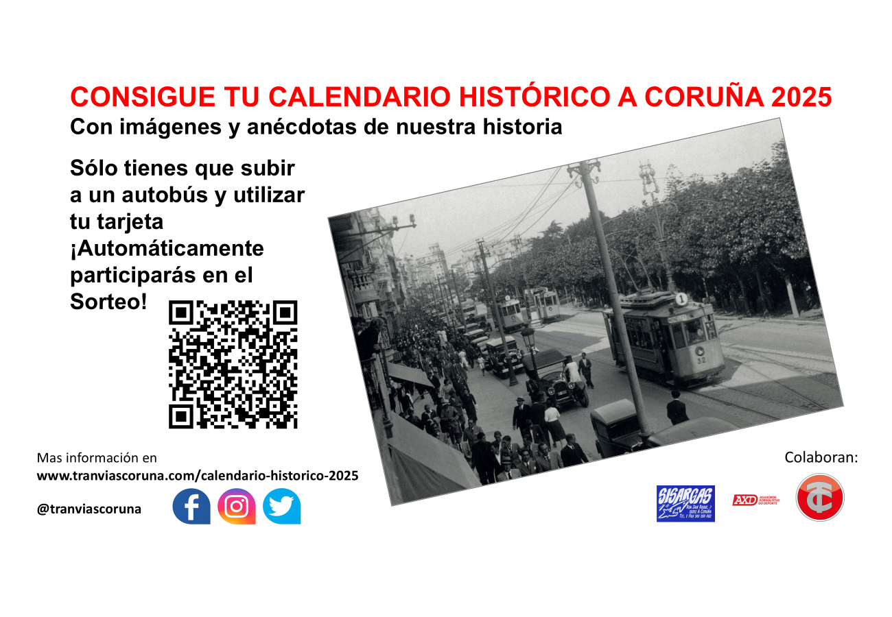 La Compañía de Tranvías de La Coruña, S.A. organiza un sorteo del Calendario Histórico de A Coruña 2025, en colaboración con Asociación Galega de Xornalistas do Deporte (Agaxorde) y la Librería Sisargas, desde el 11 de noviembre al 10 de diciembre de 2024, ambos incluidos.