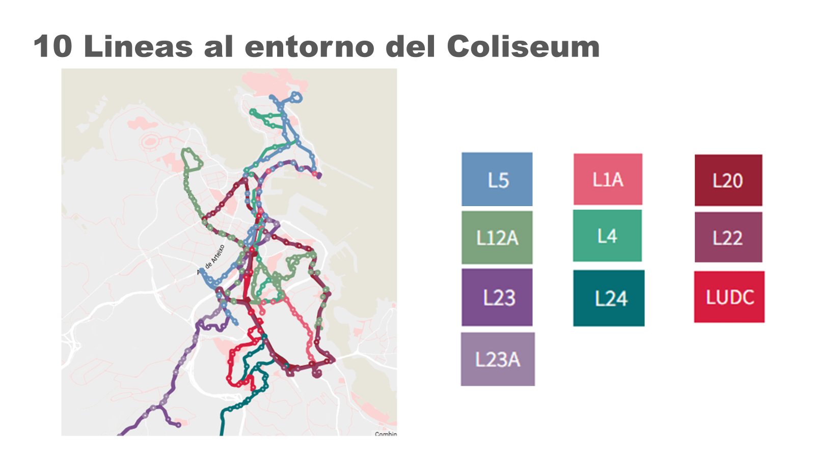 El próximo domingo día 29 a las 18:30 horas se juega en el Coliseum un partido de baloncesto entre el Básquet Coruña y el Real Madrid. Por este motivo y para facilitar el acceso a las inmediaciones del Coliseum se pondrá en servicio la línea de la UDC desde la Plaza de Pontevedra al Campus de Elviña, se hará la primera salida de Plaza de Pontevedra a las 17:00 horas manteniendo una frecuencia de 10 minutos hasta 18:30 horas, se reanudará este mismo servicio a la finalización del encuentro.