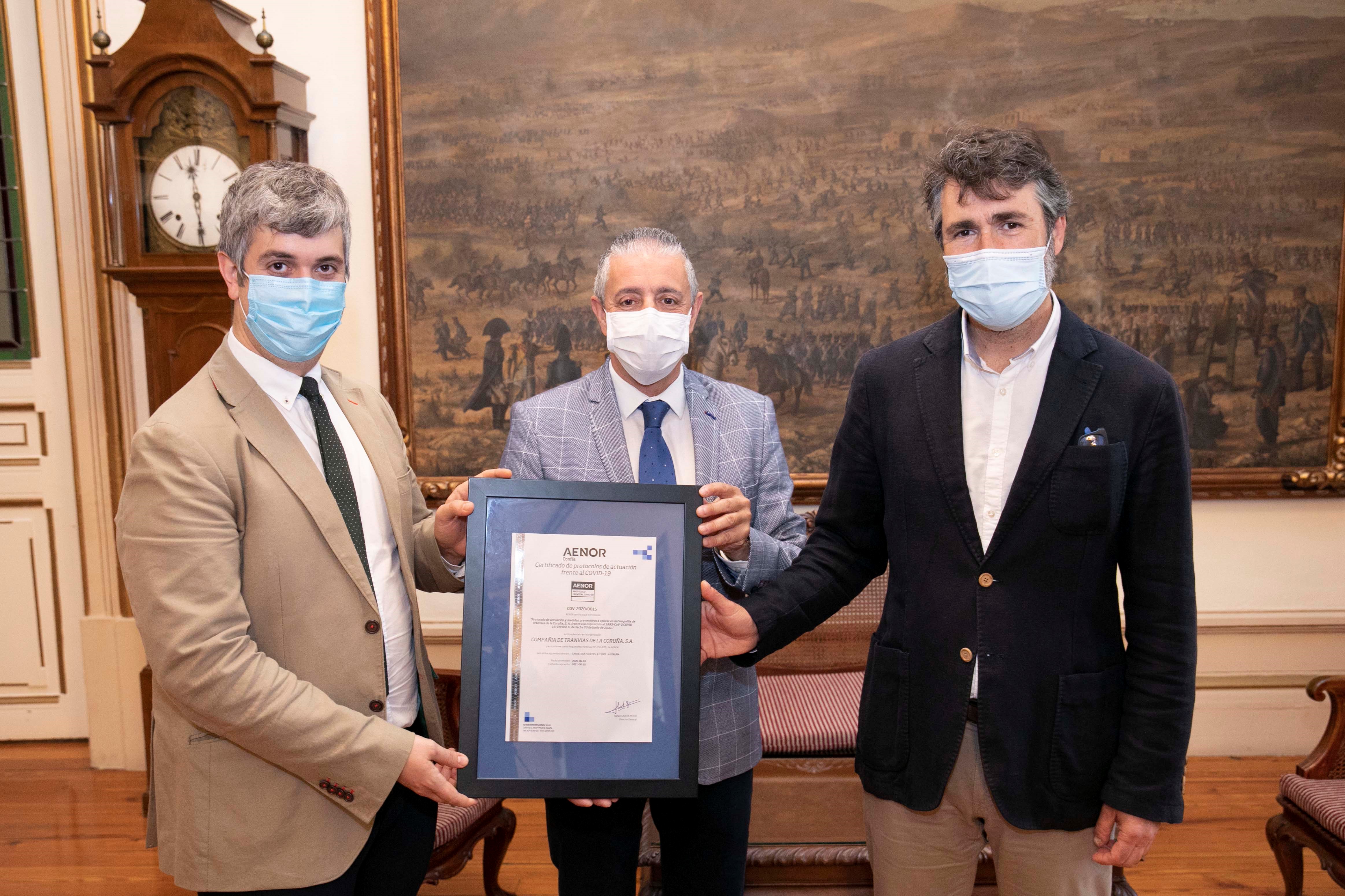 El compromiso de la Compañía de Tranvías de convertir el autobús en un espacio seguro para viajar y su eficacia a la hora de implantar las medidas de protección para viajeros y conductores se ha visto refrendado por la certificación AENOR frente al COVID-19. El Concello de A Coruña acogió esta mañana el acto de entrega del certificado, en una comparecencia a la que asistieron el concejal de Urbanismo, Vivienda, Infraestructuras y Movilidad, Juan Díaz Villoslada; el director de la Compañía de Tranvías, Ignacio Prada, y el director de AENOR en la Región Atlántica, Martín Pita.