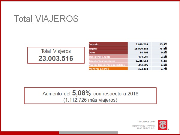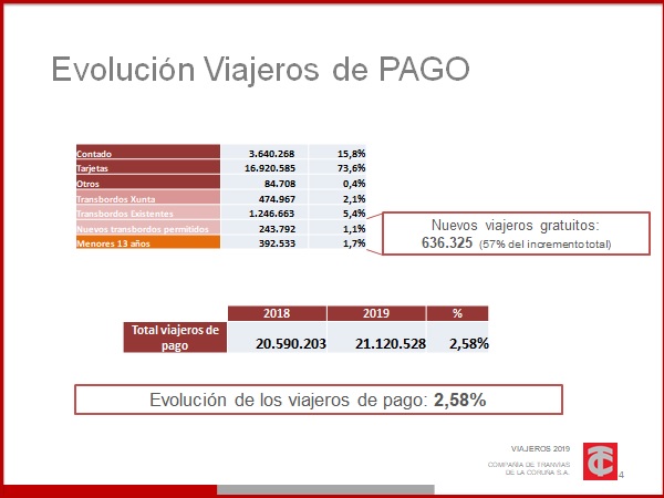 Cabe destacar que durante o ano 2019 establecéronse 2 novos perfís gratuítos: a extensión da gratuidade do transbordo entre todas as liñas e o perfil de menores de 13 anos. Ambos tiveron 243.792 e 392.533 viaxeiros respectivamente, o cal supón un total de 636.325 novos viaxeiros gratuítos, un 57% do incremento total de 1,1 millóns.