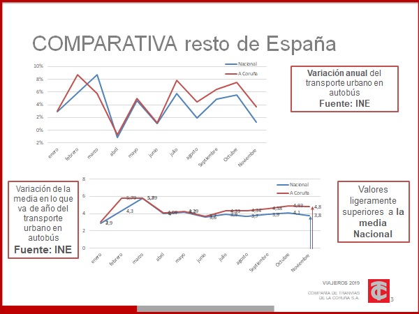 Comparándonos cós datos mensuais ofrecidos polo INE, obsérvase que a evolución de viaxeiros durante o ano 2019 foi á par ca media nacional durante a primeira metade do ano. A partir de xullo, o incremento de viaxeiros increméntase lixeiramente con respecto á media nacional.
