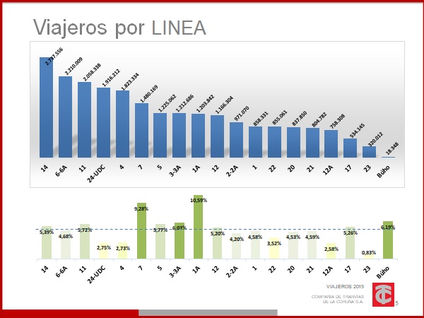 As liñas con maior incremento de viaxeiros foron a 1A e a 7. No caso da 1A cabe mencionar o incremento do servizo ofrecido por primeira vez durante o 2019 a Santa Cristina, o que supuxo unha parte importante do crecemento desta liña, aínda que a liña 7, que apenas sufriu cambios, obtivo un crecemento similar.